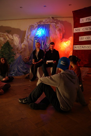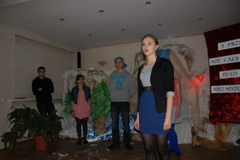 27 października młodzież naszej placówki uczciła rocznicę pontyfikatu papieża Jana Pawła II, uczestnicząc w przygotowanym przez wychowawczynie: p. D. Gil i p. A. Wielgos oraz grupę koleżanek i kolegów przedstawieniu słowno – muzycznym poświęconym Jego pamięci. Zawierający filozoficzne przesłania spektakl składał się z kilku scenek, ukazujących najczęstsze problemy i rozterki współczesnego człowieka. Na scenie pojawiła się więc matka zatroskana o przyszłość swoich dzieci, czy zagubiona w chaosie dzisiejszego świata młoda narkomanka. Każda ze scenek zawierała myśl Wielkiego Polaka, będącą zarazem wskazówką, jak godnie przejść przez życie. „Zwyciężajmy dobrem zło” – to jedno z przesłań papieża – Polaka, przypomniane przez młodych artystów.