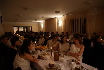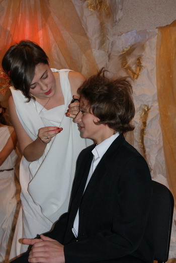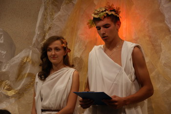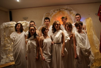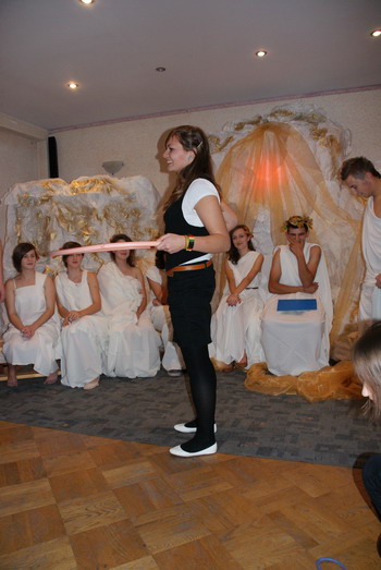 Pasowanie na Wychowanka To było spotkanie na szczycie … Olimpu. Tego wieczoru Bursę we władanie wzi±ł sam Zeus , by wraz ze swoj± żon± Her± oraz Hermesem i spółk± dokonać mianowania pierwszaków na pełnoprawnych mieszkańców placówki. Zanim jednak to nast±piło, pierwszoklasi¶ci musieli wykazać się różnorodnymi umiejętno¶ciami. Łatwo nie było, ale bohaterowie wieczoru błysnęli form± i bez problemu poradzili sobie z wymy¶lnymi zadaniami. Bez skrzywienia wypili napój i zjedli potrawę, które w smaku nie miały nic wspólnego ani z nektarem, ani z ambrozj±. Z godno¶ci± poddali się upiększaj±cym zabiegom kosmetycznym i fryzjerskim zaoferowanym przez sam± Afrodytę (efekt był imponuj±cy). Nie mieli też najmniejszych problemów z wykonaniem zadań sprawno¶ciowych. Olimpijsko - bursianym bogom nie pozostało nic innego, jak wręczyć akt przyjęcia w poczet mieszkańców Bursy całej 65 –cio osobowej grupie pierwszoklasistów. Po emocjonuj±cej czę¶ci oficjalnej, nadszedł czas na poczęstunek. Przy pięknie udekorowanych stołach, do wspólnego posiłku z bogami zasiedli ¶wieżo upieczeni bursiacy i ich opiekunowie, z dyrekcj± ZPO-W na czele oraz, reprezentuj±cy władzę ziemsk±, Naczelnik Wydziału O¶wiaty p. Bartłomiej Kordas.To uroczyste spotkanie odbyło się z inicjatywy opiekunów najmłodszych grup, wychowawczyń: p. Jagody Ilić i p. Ewy Żurawskiej oraz MRB.