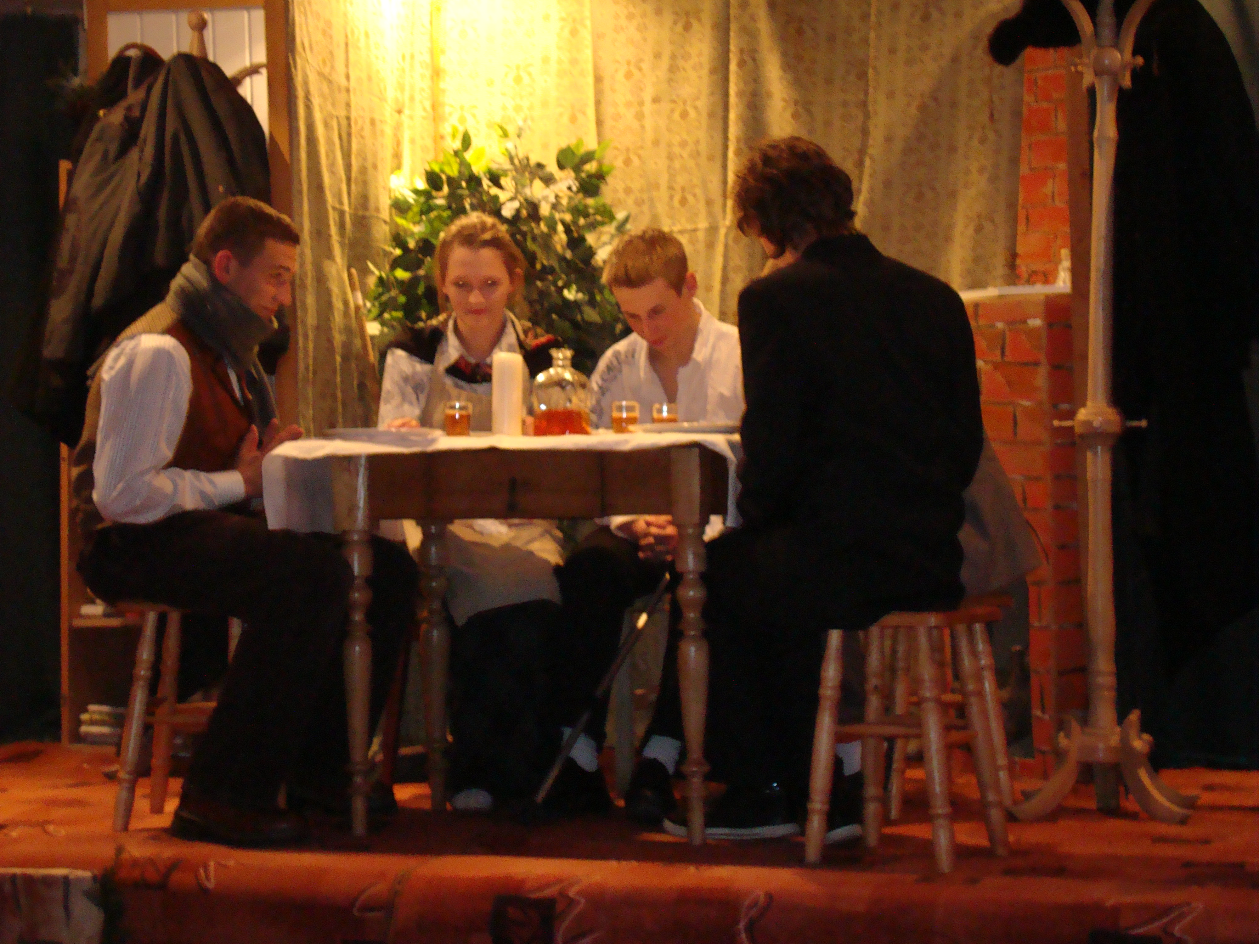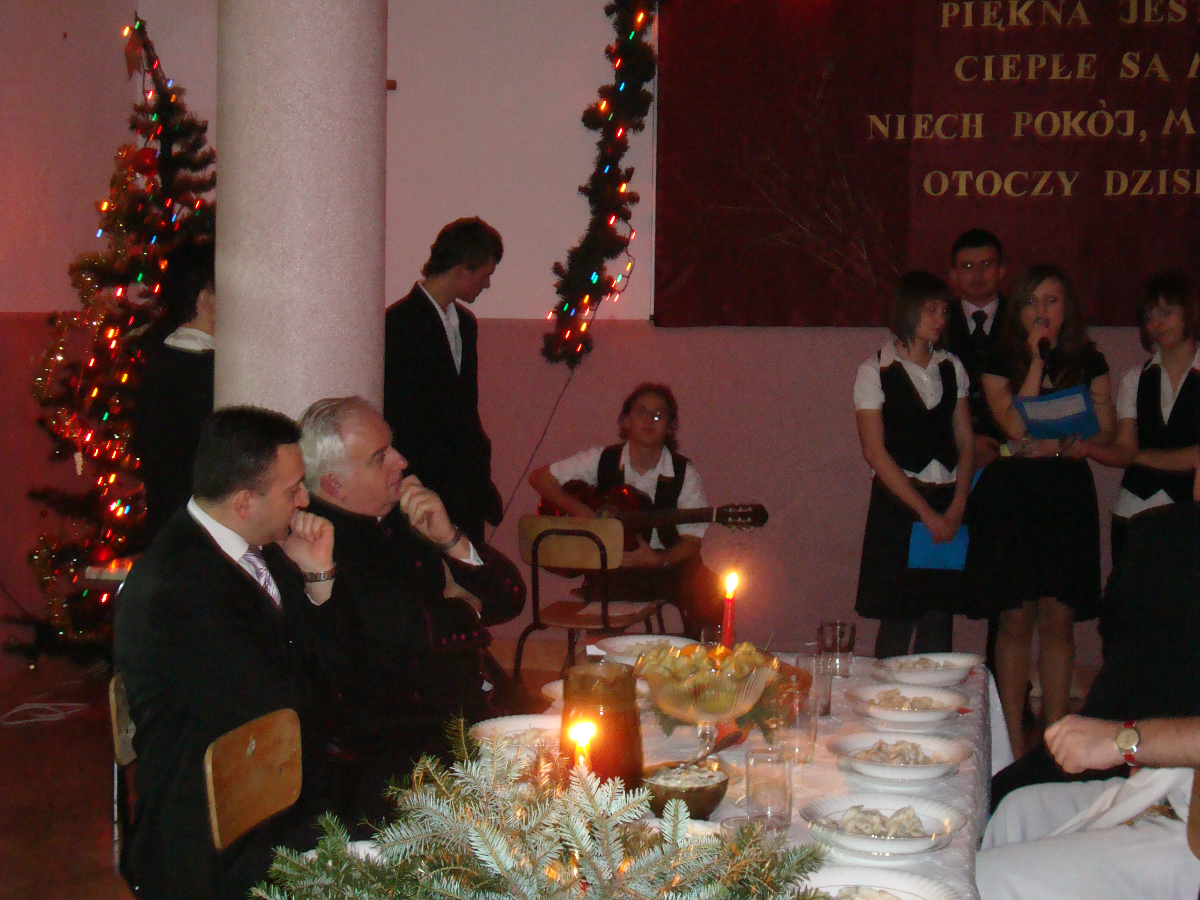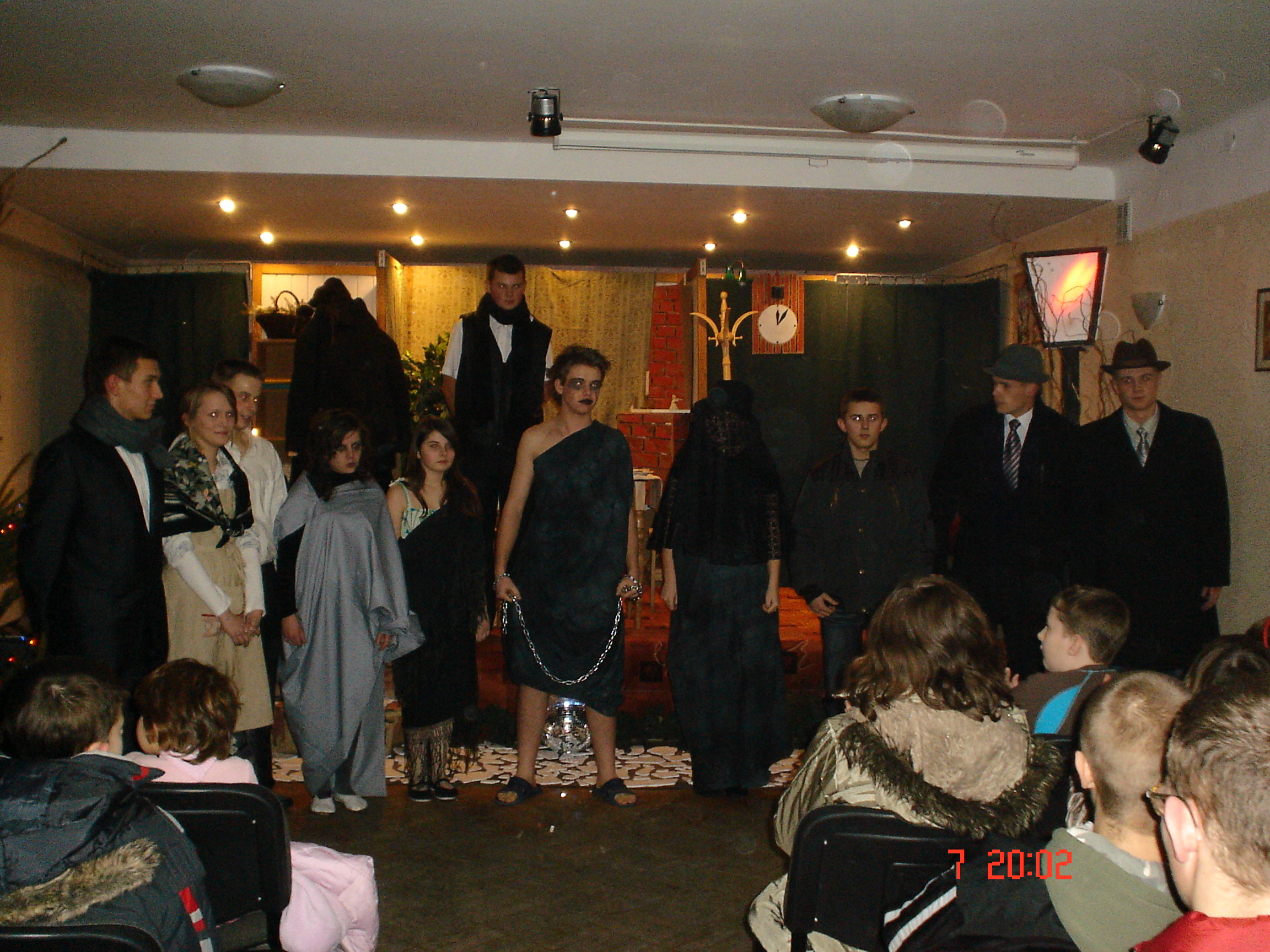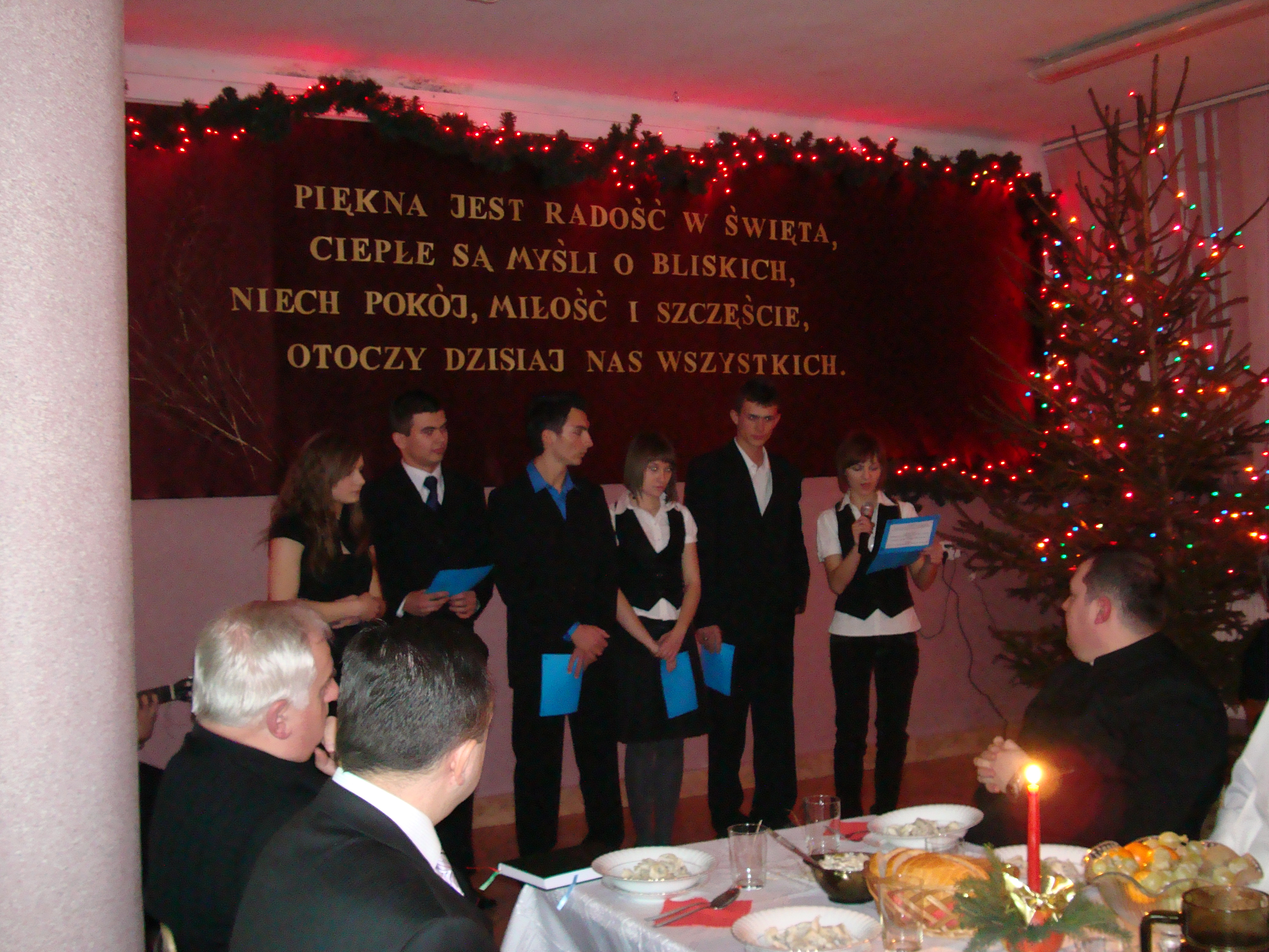 W poniedziałkowy wieczór, 21.12.09 r. wychowankowie bursy wraz z dyrekcją, gronem pedagogicznym i zaproszonymi gośćmi uczestniczyli w tradycyjnym Wieczorze Wigilijnym. Zanim wszyscy zasiedli przy świątecznie zastawionych stołach, zebrali się w świetlicy, aby wspólnie obejrzeć przygotowany przez aktorsko uzdolnionych bursiaków program artystyczny. Tym razem nie były to tradycyjne jasełka, ale przedstawienie oparte na motywach powieści Karola Dickensa "Opowieść wigilijna", które z wielkim kunsztem wyreżyserowały wychowawczynie ; p. Jadwiga Ilić i p. Ewa Lubas.