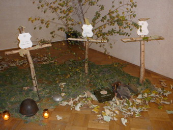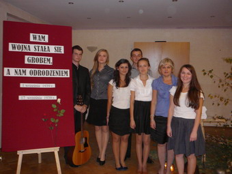 „Wam wojna stała się grobem, a nam odrodzeniem” 29.09.2011r. wychowankowie naszej placówki wraz z wychowawcami zebrali się w świetlicy bursy, by uczestniczyć w wieczornicy przygotowanej dla uczczenia rocznicy wybuchu II Wojny Światowej. W ciekawej scenerii (brzozowe krzyże, płonące znicze, jesienne liście), młodzież recytowała pełne zadumy wiersze o tematyce wojennej. Atrakcją programu była prezentacja zdjęć okupowanego Jarosławia. Nie zabrakło też piosenek, które w czasie wojny dodawały otuchy polskim żołnierzom, a które teraz brawurowo wykonały Paulina Chodzińska i Natalia Ziojła przy akompaniamencie gitarowym Łukasza Kudyby. Podniosły nastrój uroczystości potęgowały znicze, które wychowankowie zapalali w trakcie programu i ustawiali pod symbolicznymi krzyżami. „Swoją postawą i zachowaniem złożyliście ofiarom II wojny należyty hołd” – podsumowała uroczystość p. Dorota Gil, która wraz z p. Alicją Wielgos, wychowankami: Magdą Niedużak, Żanetą Zarosa ,Tomkiem Niedużak oraz ze wspomnianym zespołem muzycznym, program przygotowała.