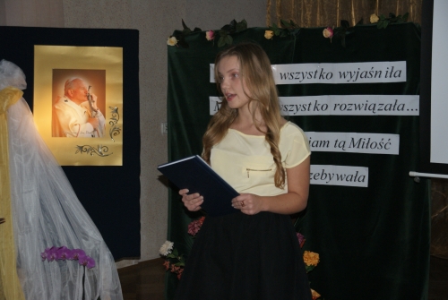 W czasie wieczornicy usłyszeliśmy „Hymn do miłości” Św. Pawła, który w sposób zwięzły i zasadniczy mówi, że człowiek, który nikogo nie kocha, jest... nikim. Przesłaniem i treścią tej encykliki była także rodzina – kolebka miłości wszystkich do ... wszystkich. Oprócz utworów poetyckich młodzież miała okazję posłuchać refleksyjnych utworów na pianino i trąbkę. Wszystko to wraz z ciekawą scenografią było tłem do poznania niezwykle bogatego i pięknego życia Jana Pawła II.