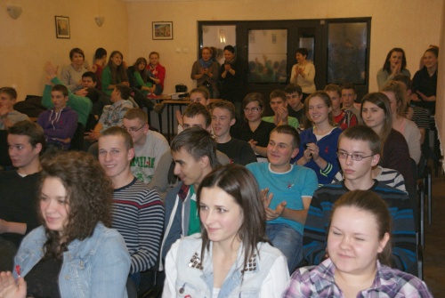 My również mieliśmy swój wkład w organizację wieczoru: wręczaliśmy ulotki i broszury, zawierające szczegółowe informacje na temat HIV i AIDS oraz przypinaliśmy uczestnikom spotkania czerwone wstążeczki, symbolizujące solidarność z ludźmi żyjącymi z HIV i chorymi na AIDS. Zaprezentowaliśmy także krótkie przedstawienie, poruszające temat ucieczki młodego człowieka od problemów życiowych w narkotyki oraz jej konsekwencji w postaci zarażenia się wirusem HIV. Po raz kolejny mieliśmy możliwość podziwiania wielkich talentów aktorskich: Małgosi, Kingi, Magdy, Sebastiana, Andrzeja, Huberta, Kamila i Grzesia.