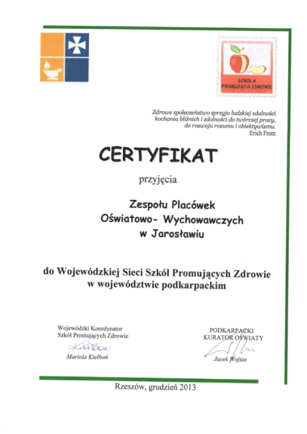 UZYSKANIE WOJEWÓDZKIEGO CERTYFIKATU 04.12.2013r. nasza placówka została wyróżniona Wojewódzkim Certyfikatem Sieci Szkół Promujących Zdrowie. Certyfikat taki otrzymuje szkoła lub placówka podejmująca systemowe działania w zakresie edukacji zdrowotnej. W latach 2010-2013r. realizowaliśmy różne przedsięwzięcia edukacyjne, prozdrowotne, profilaktyczne mające na celu poszerzenie wiedzy oraz zwiększenie świadomości młodzieży. Wojewódzkie Certyfikaty zostały nadane kilunastu placówkom z obszaru Podkarpacia i wręczone podczas uroczystości zorganizowanej przez Urząd Wojewódzki w Rzeszowie. W spotkaniu udział wzięli Wojewoda Podkarpacki pani Małgorzata Chomycz-Śmigielska oraz Podkarpacki Kurator Oświaty pan Jacek Wojtas, którzy docenili starania nauczycieli i wychowawców, pogratulowali im osiągnięć i życzyli dalszych sukcesów. Z ramienia naszej placówki certyfikat odebrala pani dyrektor Helena Panek oraz koordynatorki do spraw promocji zdrowia w naszej placówce pani Jadwiga Ilič i pani Ewa Lubas.