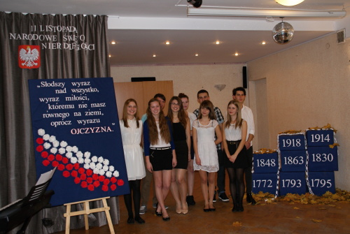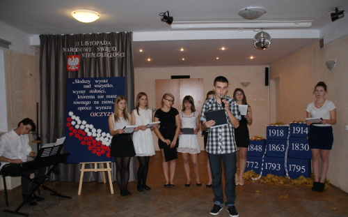 „Słodszy wyraz nad wszystko, wyraz miłości, Te słowa Adama Mickiewicza były myślą przewodnią uroczystej wieczornicy patriotycznej, która odbyła się 13.11.2014r.w naszej placówce z okazji Narodowego Święta Odzyskania Niepodległości. Święto to jest jednym z najważniejszych świąt patriotycznych obchodzonych w naszym kraju. Aby uczcić kolejną rocznicę odzyskania niepodległości, przypomnieć ważne i tragiczne wydarzenia z historii Polski, siłę narodu polskiego, jego wolę przetrwania i uparte dążenia Polaków do odzyskania wolności, które stały się podstawą do odrodzenia wolnej Polski młodzież zaprezentowała program słowno-muzyczny. Przeplatały się w nim fakty historyczne, młodzież recytowała wiersze o tematyce patriotycznej między innym: „Ojczyzna”, „Moja piosnka”, ”Polsko nie jesteś Ty już niewolnicą” i wiele innych. Nie zabrakło także piosenek o tematyce patriotycznej takich jak: „Niepodległość”, „Wolność”, „Wojenko, wojenko”.