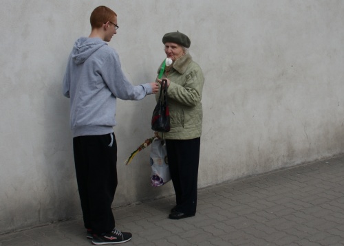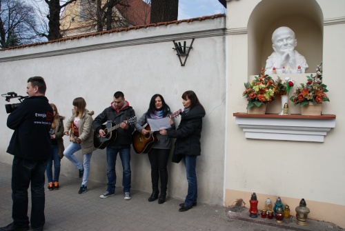 Po drodze wspólnie śpiewaliśmy piosenki, mieliśmy wspaniały akompaniament, więc muzyka sama cisnęła się na usta. Pierwszym przystankiem było popiersie Wielkiego Polaka Jana Pawła II Inicjatora Dnia Świętości Życia, święto to przypada właśnie dzisiaj, w dniu naszego marszu, 25 marca. Tam wspólnie z Księdzem Władysławem Dubiel zaśpiewaliśmy ulubioną pieśń Jana Pawła II Barkę, krótka modlitwa, ksiądz pogratulował nam naszej inicjatywy i obiecał, że wesprze nas w kolejnych marszach.