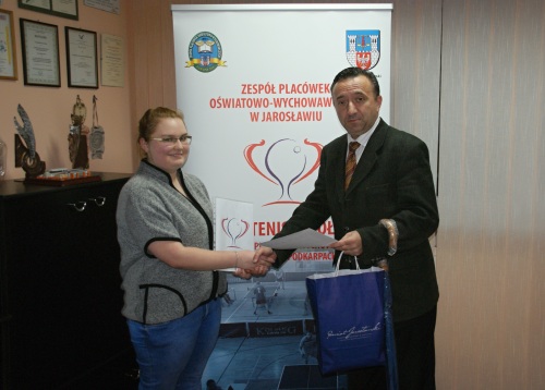 od dziewięciu lat Bursa organizuje. Najbardziej spodobał się pomysł/projekt autorstwa Izabeli Morawskiej, wychowanki z grupy III, na co dzień uczennicy III klasy technikum, na kierunku technik usług fryzjerskich, w Zespole Szkół Spożywczych, Chemicznych i Ogólnokształcących w Jarosławiu, który został przyjęty odtąd jako oficjalne logo turnieju, czego odzwierciedleniem stało się umieszczenie go na nowo wykonanym stojaku reklamowym, tzw. roll-up’ie na tegoroczną edycję zawodów. W dniu 24.11. zwyciężczyni turnieju otrzymała z rąk dyrektora placówki nagrodę w postaci drobnych upominków rzeczowych. Na zdjęciu poniżej laureatka konkursu wraz z dyrektorem Zespołu na tle nowo wykonane go roll-up’a reklamowego. Gratulujemy!
